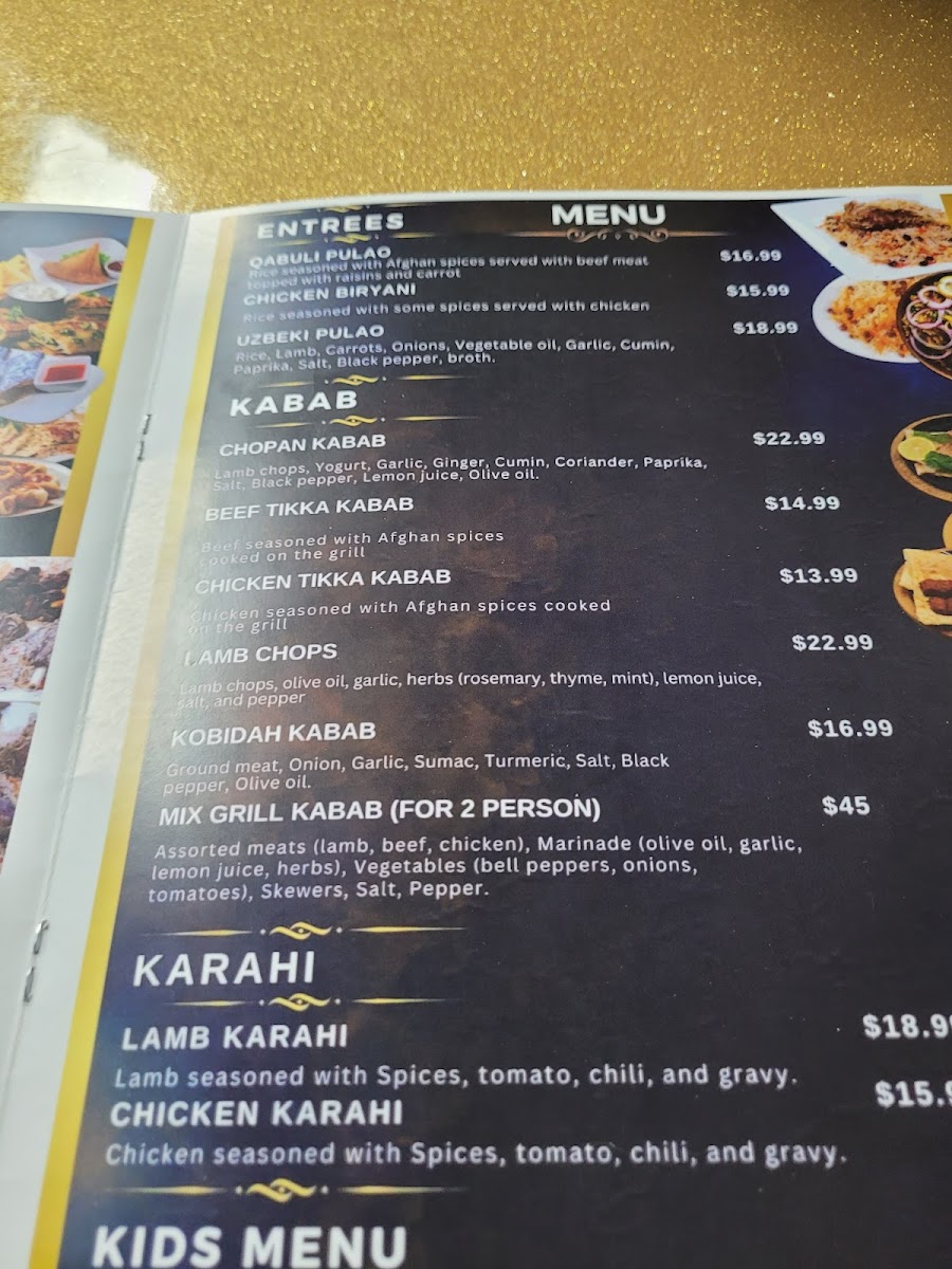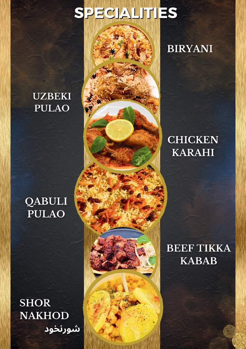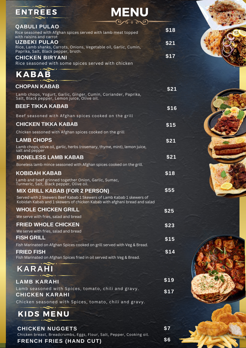 When it comes to Entrees, there are several hearty options, including the aromatic Qabuli Pulao, the flavorful Uzbeki Pulao, and the beloved Chicken Biryani. These dishes showcase rich spices and tender meat, providing a fulfilling meal.