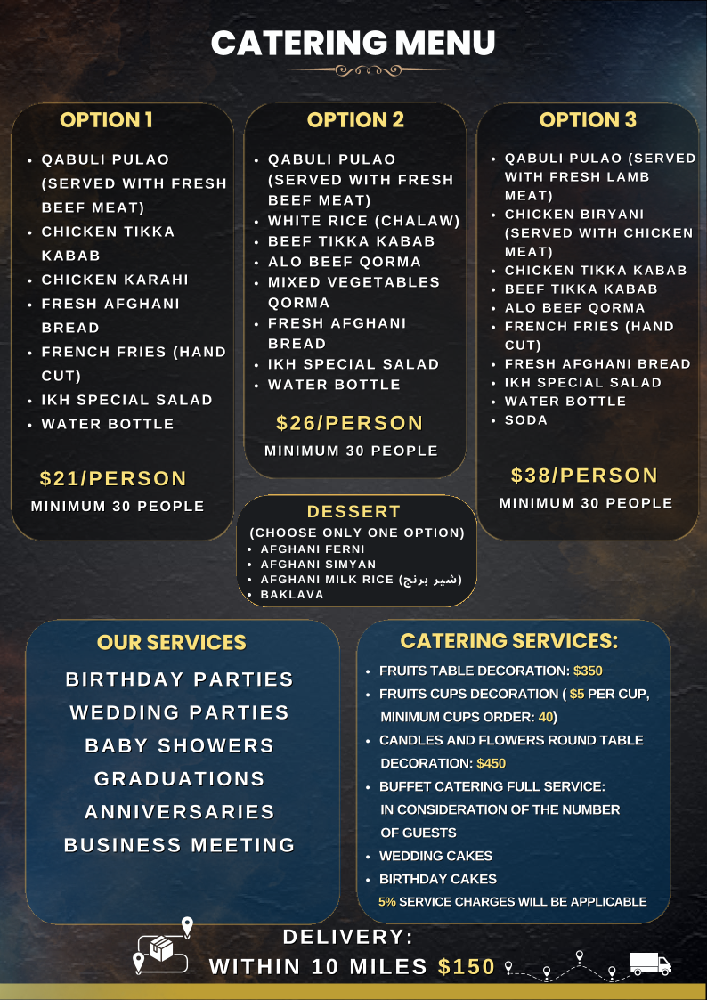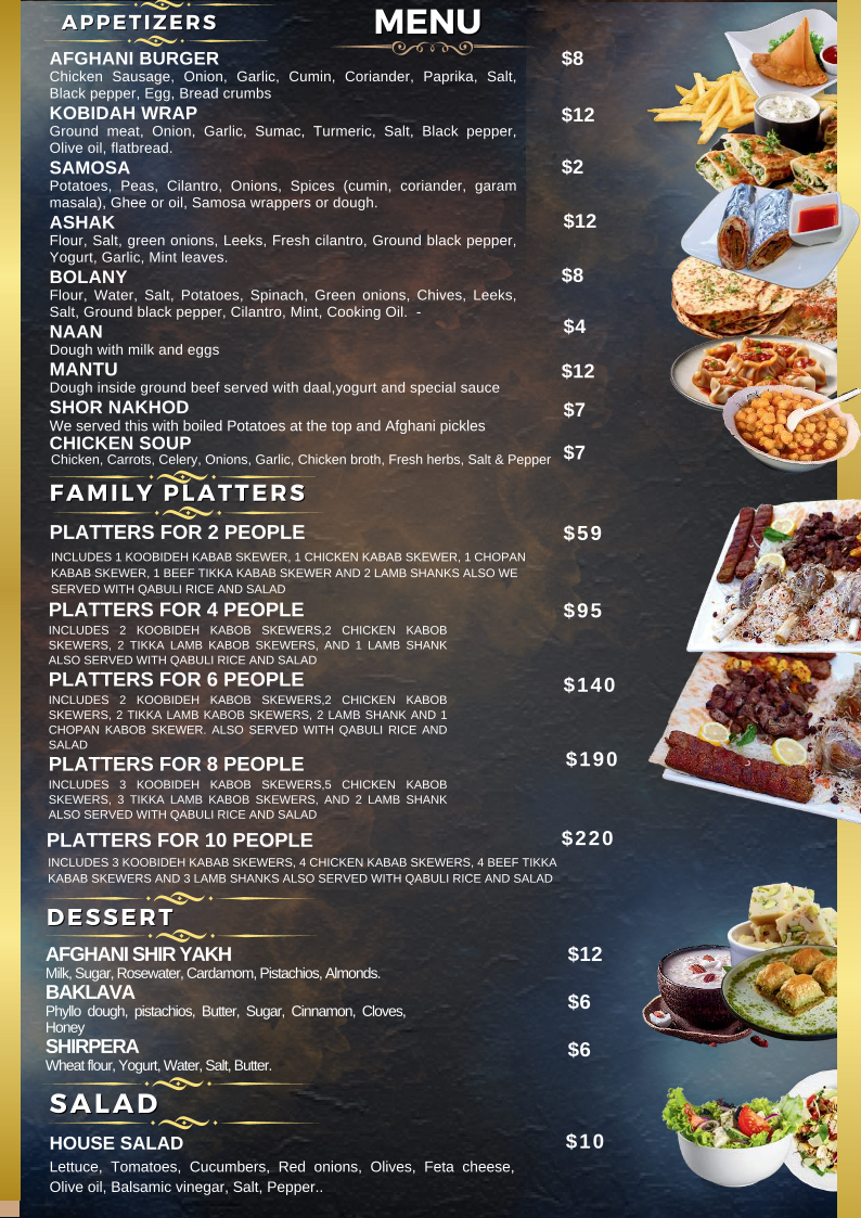 The menu at International Kabab House offers a delightful variety of dishes that cater to all tastes, blending traditional Afghan and Middle Eastern flavors. Their Appetizers are a great start to the meal, with options like the Afghani Burger, Kobidah Wrap, and Samosaashak. Each appetizer brings something unique to the table, with the Afghani Burger and Kobidah Wrap adding a flavorful twist to familiar favorites.