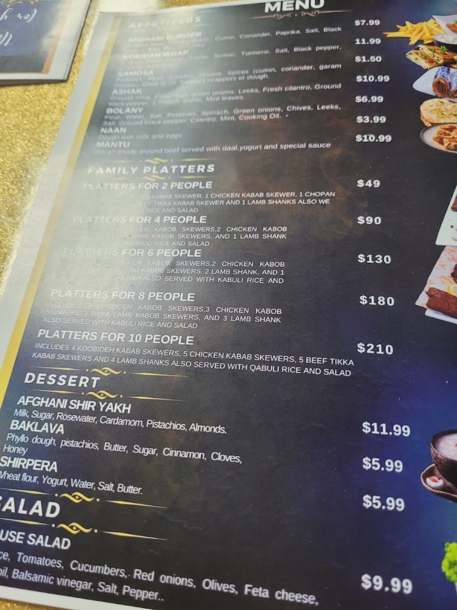 For dessert, you can indulge in traditional treats like the Afghani Shir Yakh, a frozen yogurt dessert, or the rich Baklava. Another delightful option is Shirpera, a unique Afghan sweet.