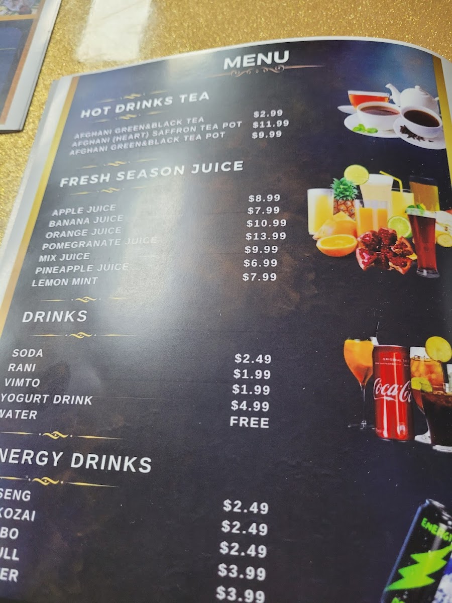 To complement your meal, choose from an array of beverages. Enjoy a traditional Afghani Green & Black Tea or the distinctive Afghani (Heart) Saffron Tea Pot for a truly authentic experience. Fresh fruit juices like Banana Fresh Juice, Apple Fresh Juice, and Mango Fresh Juice are perfect for a refreshing drink, while options like Rani, Vimto, and various energy drinks like Ginseng and Monster add variety.